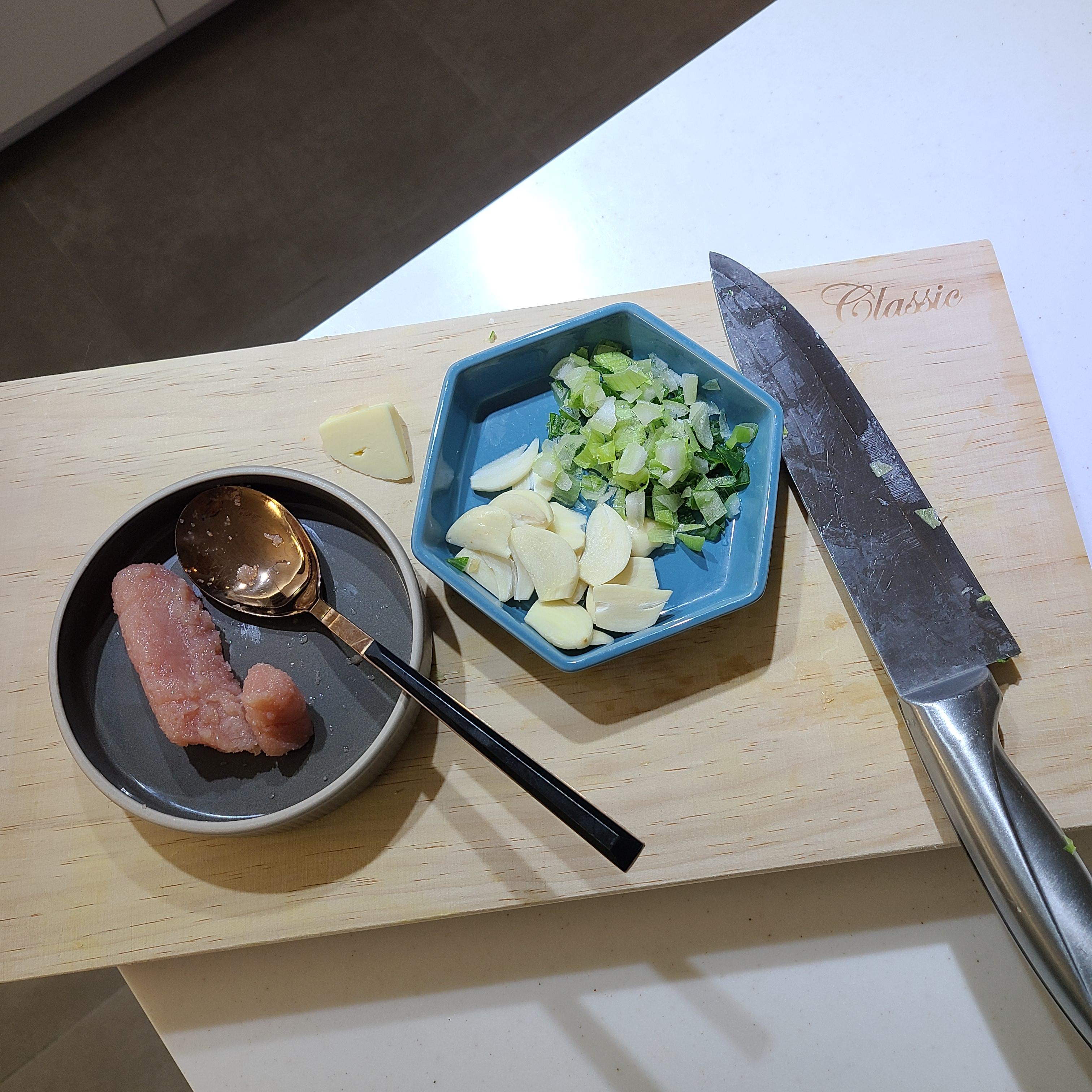 - 먼저 대파는 잘게 다져 주시고, 마늘은 편마늘로 준비해주세요.