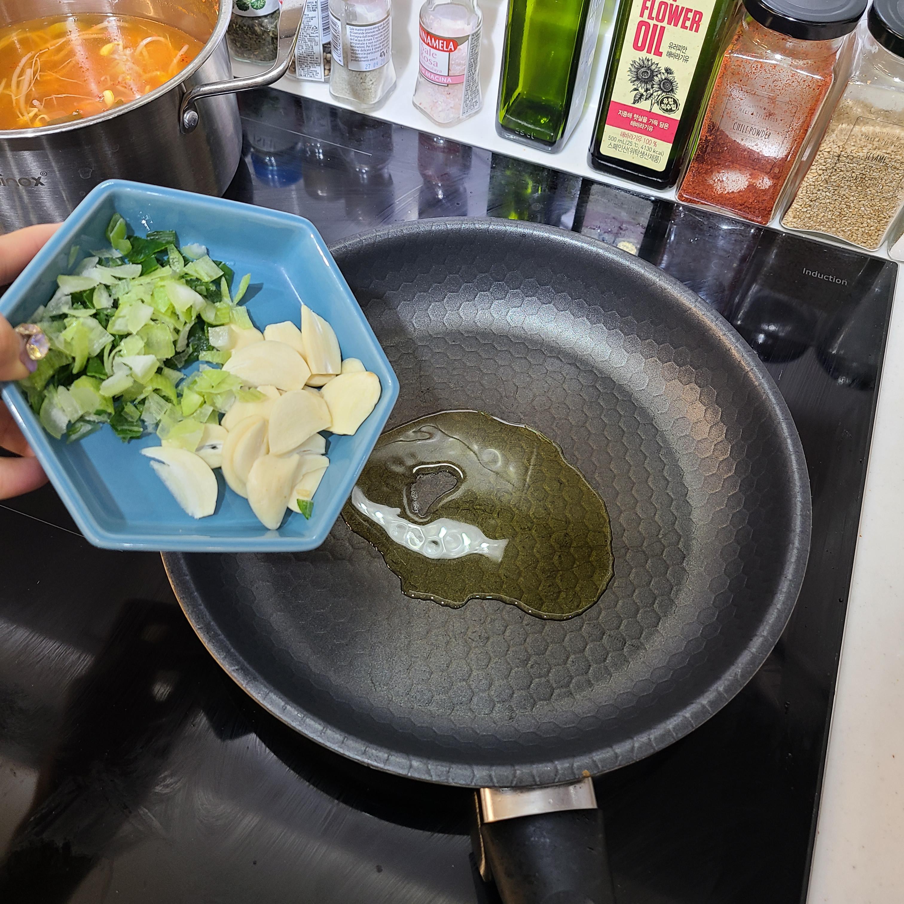 - 올리브유를 두른 팬에 먼저 마늘과 대파를 볶아 줍니다.