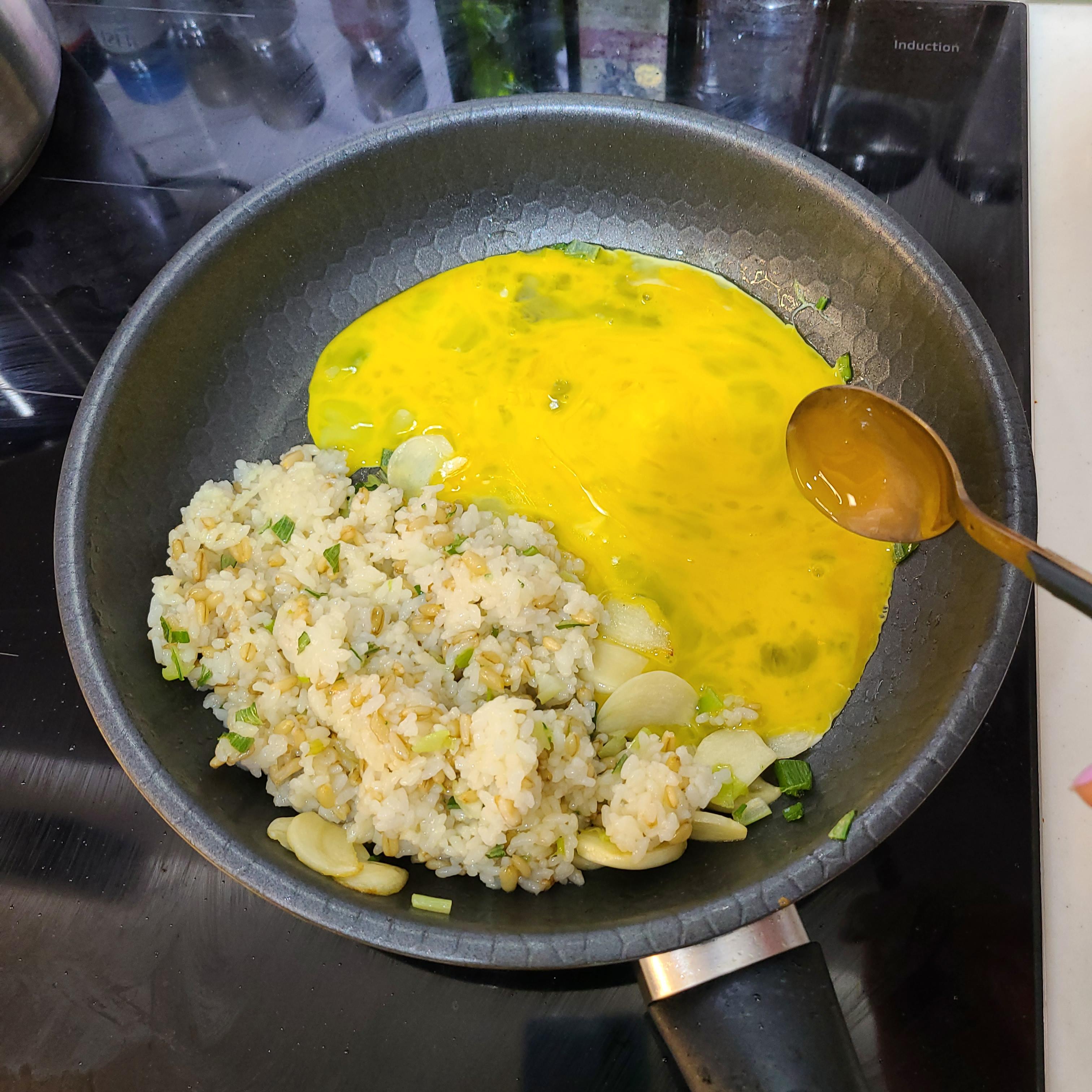 - 그리고 밥도 넣어서 함께 살짝 볶아주고, 한 쪽으로 밀어놔 주세요.