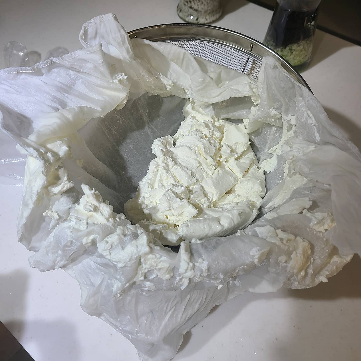 - 이렇게 채반에 올려두고 냄비에 유청이 떨어지게끔 뒀어요.